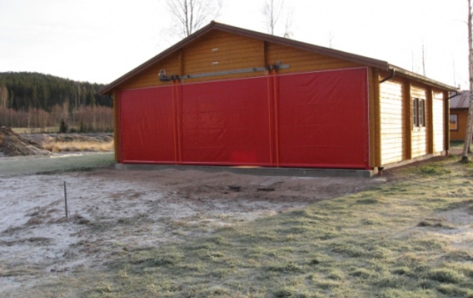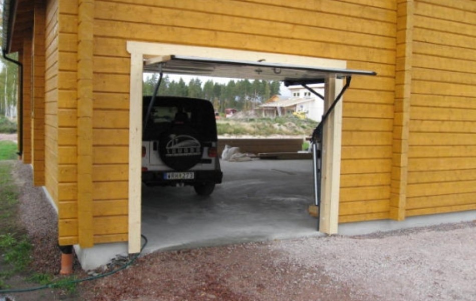 Tomoko Hangar with Forsgrens logpanel added to have the same looking as the living hose.  The hangar is isolated but not the door. It was cheaper to buy Tomokos ready built isolated elements than to have a local building company to build just an unisolated hangar. Door with its maschinery is delivered by Mondemo AB in Stallarholmen. On the backside of the hangar which means it is same sida as living house I mounted a garage door for parking the car in the hangar.