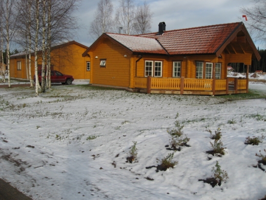 Forsgrens Log house model Lind 90. Area with veranda total 122 sq m. It works the way that I have myself to arrange building of a concrete ground frame with exact measures for the house. The frame to have holes and pipes for water, waste, air to open fire, pipes for floor heating and so on. Forsgren company then deliveres the house and set it up with their own people.