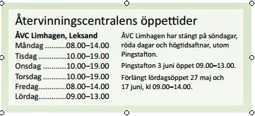 The “garbage season” has begun. From now on and going forward there will be increasingly more people in the airpark on week ends as well as on workdays. This means more garbage. More people produce more garbage. Although we have invested in extra garbage bins it still necessary to take all your bulky garbage to the garbage station by Företagshuset along with glass, metal and plastic. The recycling station Limhagen in Leksand, Limhagsvägen 23, 793 32 Leksand is open like this: