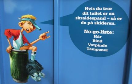 The sewer man was here! He spooled away a whole wheel barrel full of gravel and debris from the pipe leading to the pump house. Now our pipes are as clean as new from the foundry! Hopefully these guys are well paid! Not a job to be envied. But we need them. We will need them less if we are observant about what we slip into the toilet and not use it as a general garbage can. It is for human waste and toilet paper ONLY! No hair, no cotton swabs or Q-tips, sanitary napkins or tampons, used condoms etc. etc. I found this cartoon, the text is in Danish but I don’t think it needs translation!! Generally we should save water but flushing the toilet here in the airpark is one place where we should not! Use the large spool – strange expression, but you get my point.